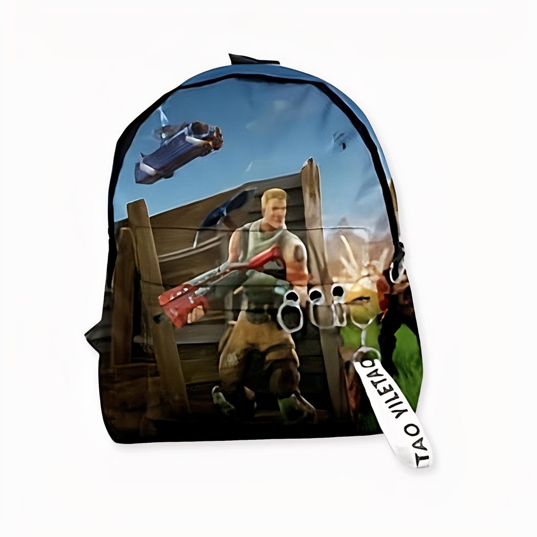 La sangle réglable et rembourrée assure le confort et le maintien tout au long de la journée. Le design est inspiré du jeu vidéo Fortnite Battle Royale et comprend des détails tels que des armes, des pièces et des emblèmes.